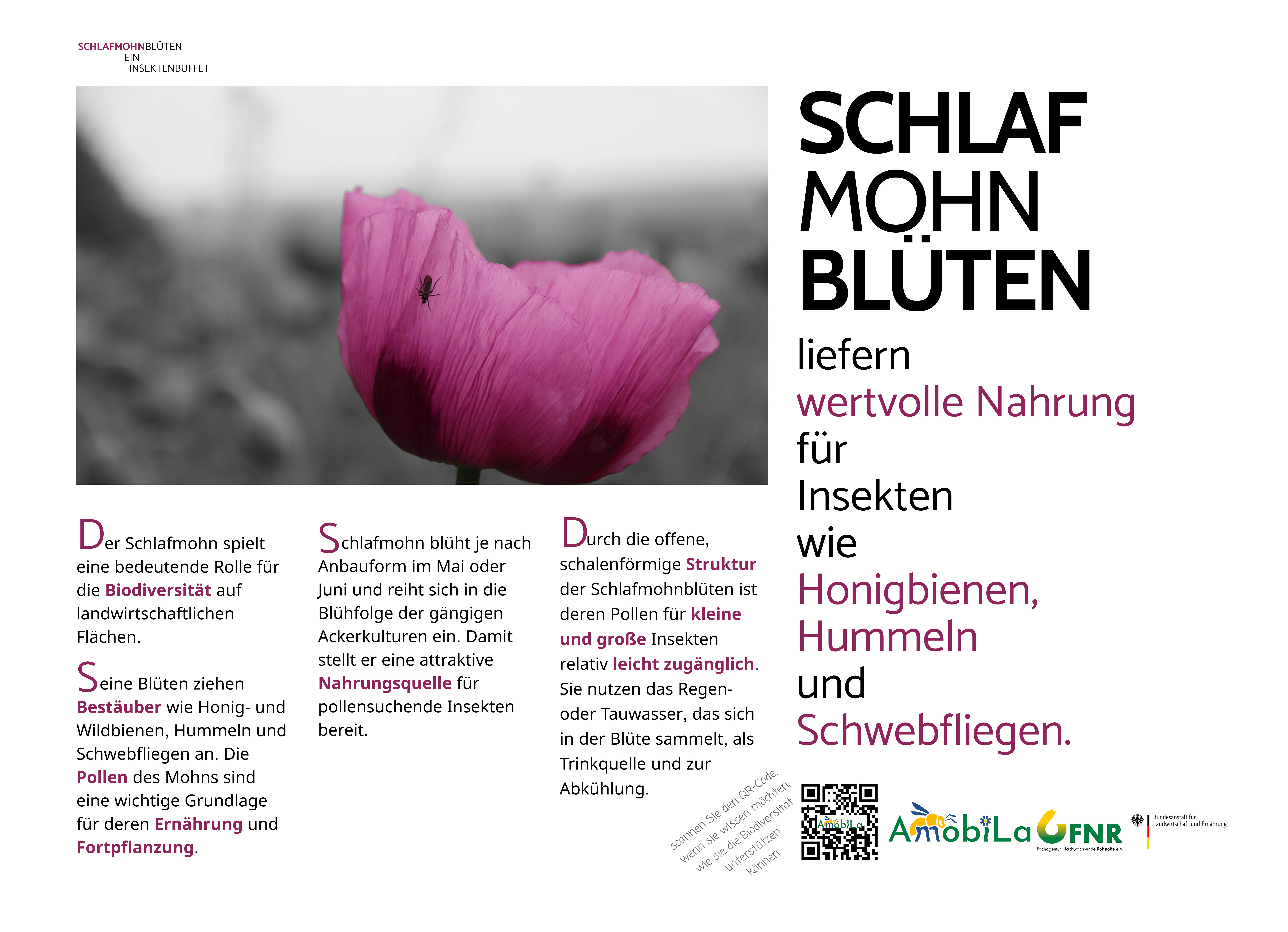 Je nach Saatzeitpunkt blüht der im Herbst ausgesäten Schlafmohn (Wintermohn) von Ende Mai bis Ende Juni. Die Blüte des im Frühjahr ausgesäten Schlafmohns (Sommermohn) beginnt Mitte Juni und reicht weit in den Juli hinein. Dies erweitert das Pollenangebot für Insekten. Denn im Gegensatz zum Frühjahr, das mit einer reichhaltigen Obst- und Rapsblüte ein hohes Nahrungsangebot für Honigbienen, Wildbienen und Schwebfliegen bereithält, ist das Blütenangebot im Sommer mit den klassischen blütenarmen Ackerkulturen (mit Ausnahme der Ackerbohne) eher mager. Somit trägt der Anbau von Schlafmohn, insbesondere, wenn er erst im Frühjahr ausgesät wurde, dazu bei, Nahrungsressourcen für pollensuchende Insekten deutlich länger bereitzustellen und Trachtlücken zu schließen.